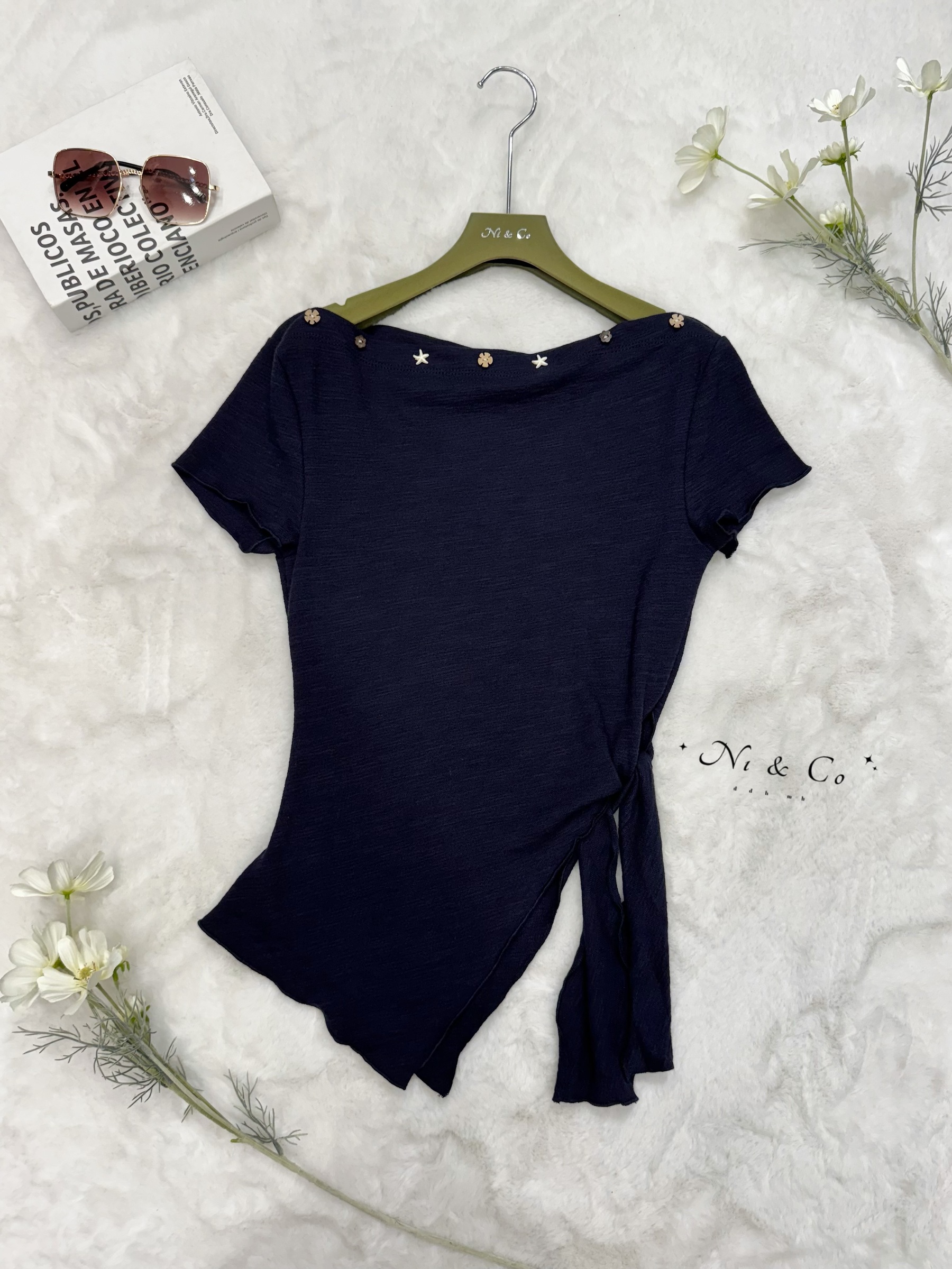 #2083 ‘再爆一個款 / 呼聲超高一字肩版本•小木扣綁帶小衫