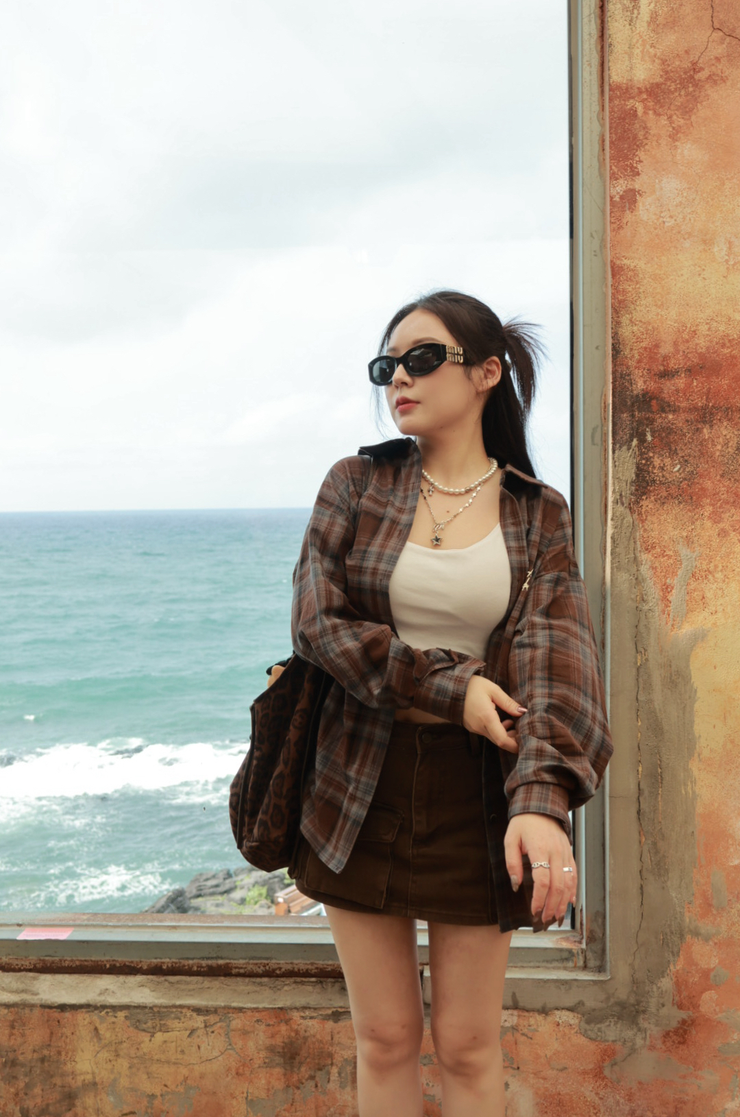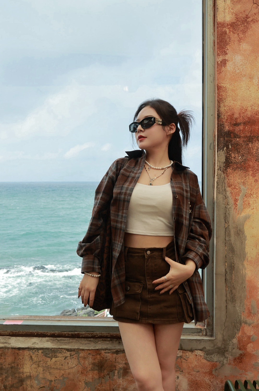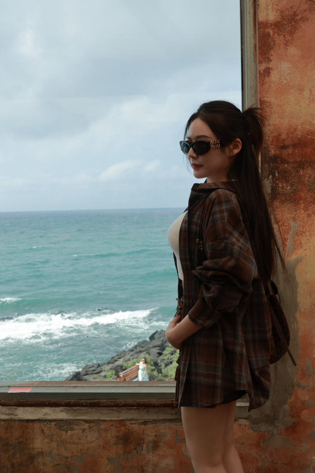 ๅœจๆตท้ขจๆ‹ๆ‰“็š„ๅˆๅพŒ๏ผŒๅฆณๆŠซไธŠไธ€ไปถ่ผ•็›ˆ็š„ๆ ผ็ด‹่ฅฏ่กซ๏ผŒ